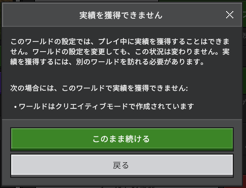 サバイバルモード(実績解除可能な状態)からクリエイティブモードやチートを有効にして変更しようとすると「実績を獲得できません」という内容のアラートが表示されます。