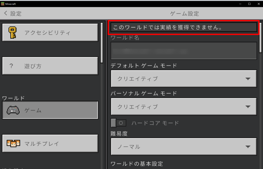 • ワールド設定によっては、作成直後から実績解除不可になる