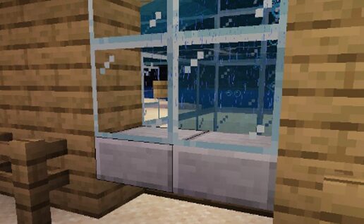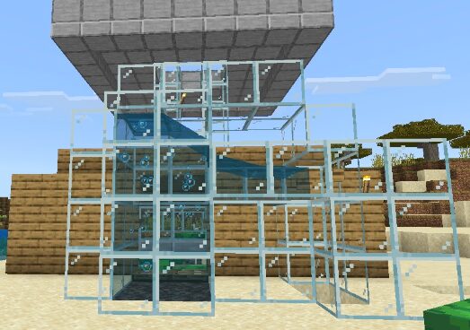 ガラスブロックを使って子ガメを処理層へ運ぶ水路を作ります。処理層へ落とす穴に水が流れないように、手前のブロックにボタンを設置します。