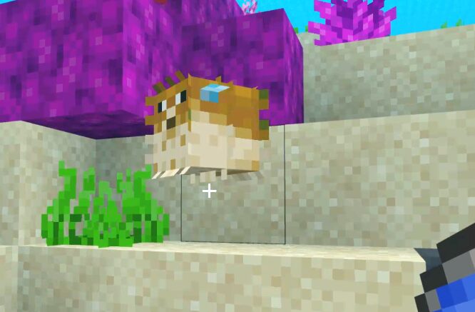 マインクラフトのフグは海に出現する友好モブです。プレイヤーにとってちょっと危険な存在です。見た目はトゲトゲしていてフグというよりハリセンボン。