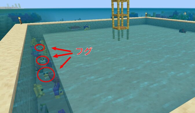 統合版では、魚は12~32ブロック離れた水中でスポーンしますので、足場ブロックなどで12ブロック離れてしばらく待機すればフグや熱帯魚が湧きます。(フグは水面でのみスポーン。)