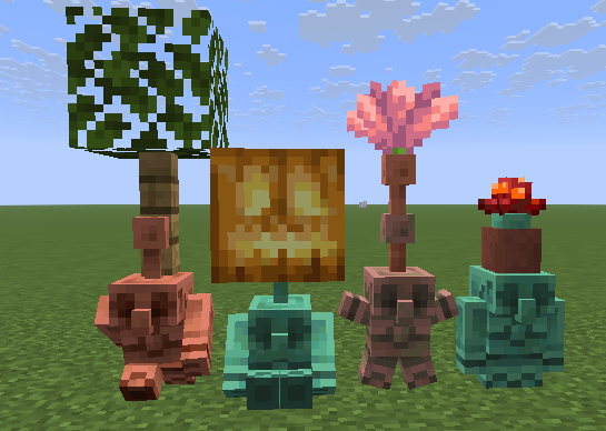 Java版限定ですが、銅像化した銅ゴーレムの頭の上にブロックを置くことができます。