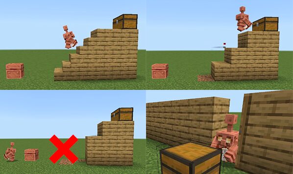 → 高さ2ブロックあっても、狭い通路や浅い水路では注意が必要です。 - 銅チェストの真下にブロックが無いとき、銅ゴーレムは認識できません。(バグの可能性あり)