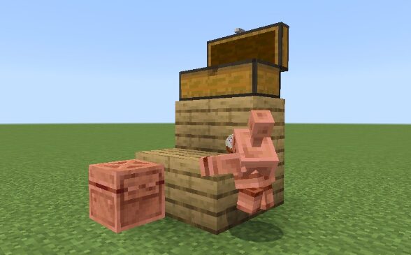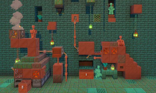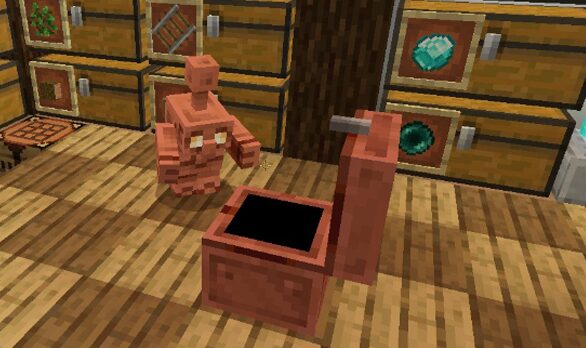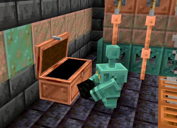 銅ゴーレム、銅のチェストは他の銅アイテムと同様には時間の経過とともに酸化し、徐々に錆びていきます。銅ゴーレムは最終段階になると完全に停止し、「銅像状態」になります。