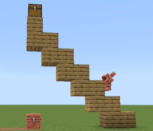 銅ゴーレム(カッパーゴーレム)は、他の一般的なモブと同様に1ブロックの高さは登ることができます。ルートに障害物があると場合でもある程度なら自力で移動できます。